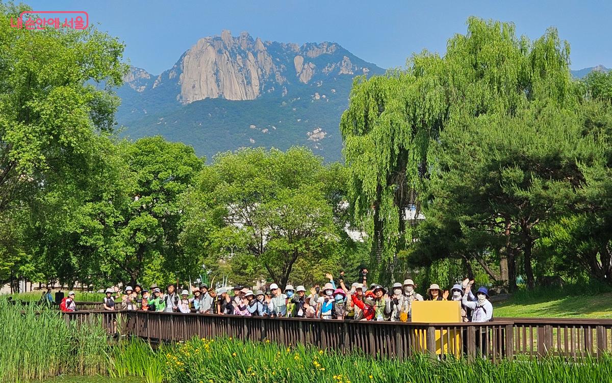 '서울둘레길 펀트래킹'참가자들이 창포원에서 단체사진을 촬영했다.
