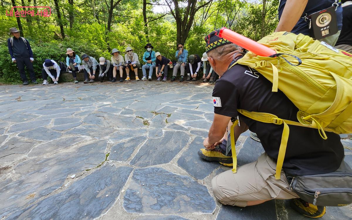 이번 1회 차 서울둘레길 펀트레킹의 하이라이트는 등산 지도사들의 ‘등산 꿀팁’ 교육이었다. 약해진 종아리와 아킬레스건을 보강하고, 족저근막염을 예방해 주는 스포츠 테이핑 방법, 올바른 등산화 신발 끈 묶는 방법, 내 몸에 맞게 등산 가방을 메는 방법, 안전한 등산 스틱 사용 방법, 등산 시 옷을 겹쳐 입는 방법 등 어디에서도 듣기 힘든 정보들을 산행 틈틈이 알려주었다.
