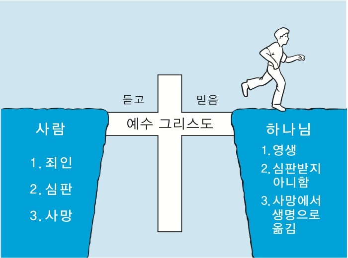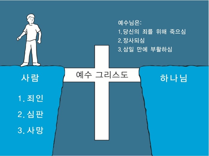 예수님께서는 우리를 죄와 사망으로부터 구원하시기 위해 십자가를 지심으로써 우리를 하나님 앞으로 나아갈 수 있게 해주는 생명의 다리가 되어주셨습니다. “다리 예화”는 복음의 핵심을 직관적으로 보고 깨달을 수 있게 해주는 효과적인 전도의 도구입니다.