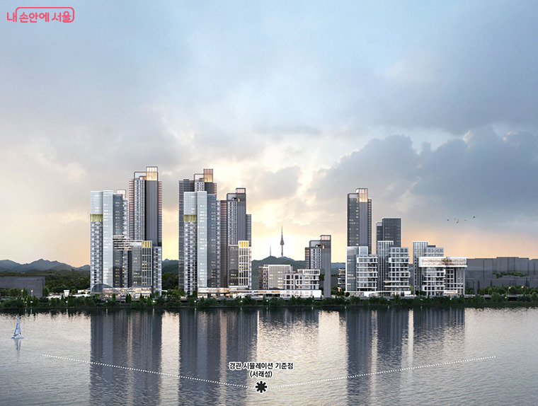 먼저, 한강, 남산과 조화로운 도시경관 창출을 위해 조망점(서래섬)에서 남산으로 열린경관을 형성하고, 유연한 높이계획을 적용해 입체적인 경관계획을 수립했다.