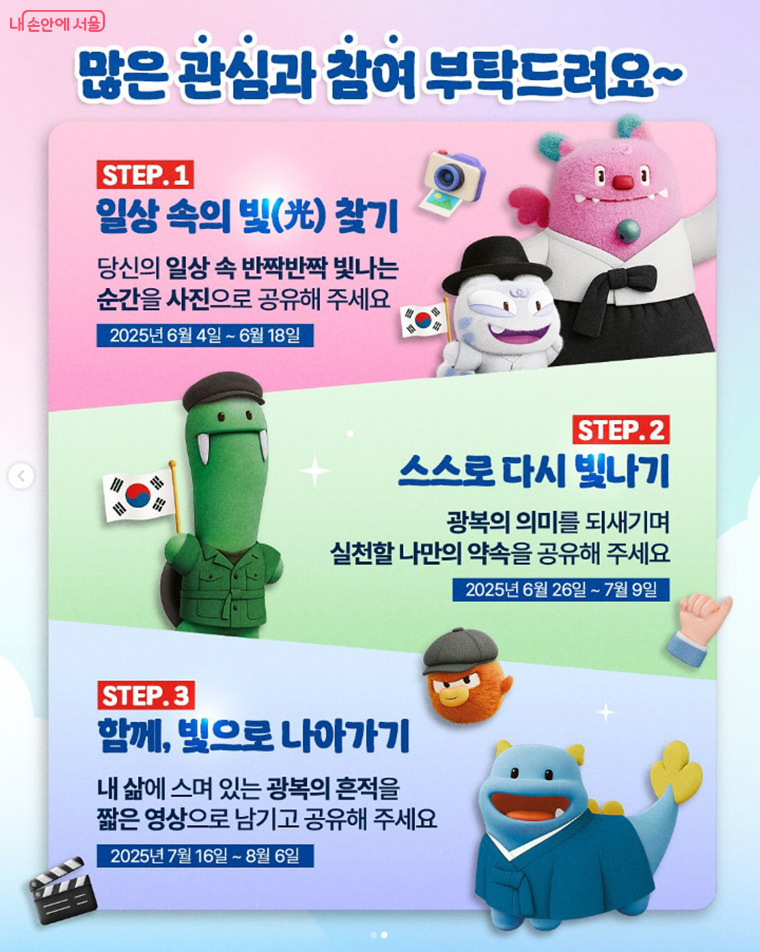 시민과 함께하는 광복 챌린지도 추진한다. 8월까지 태극기 코스프레 등 광복의 의미를 담은 사진과 동영상을 개인 SNS에 업로드한 시민에게 기념품 제공 이벤트도 진행한다. 자세한 내용은 광복 80주년 기념사업 공식 인스타그램에서 확인 가능하다.
