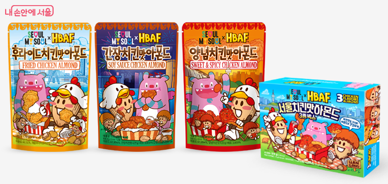 서울마이소울 1주년 기념 새로운 협업 상품인 ‘서울아몬드’ 디자인 시안. (왼쪽부터) 잠실한강공원(후라이드치킨맛), 반포한강공원(양념치킨맛), 여의도한강공원(간장치킨맛), 한강공원 박스 패키지