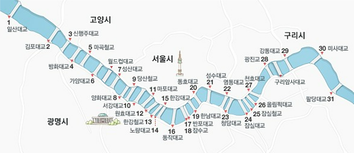 23년 11월 기준으로 현재 개통하여 통행을 하고 있는 한강 교량의 순서와 위치 이미지입니다. 강북과 강남을 잇는 수많은 교량이 있지만 이 중에서도 통행량이 유독 많은 한강 다리와 또 상대적으로 통행량이 적어 다소 교통이 원활한 다리도 있습니다.