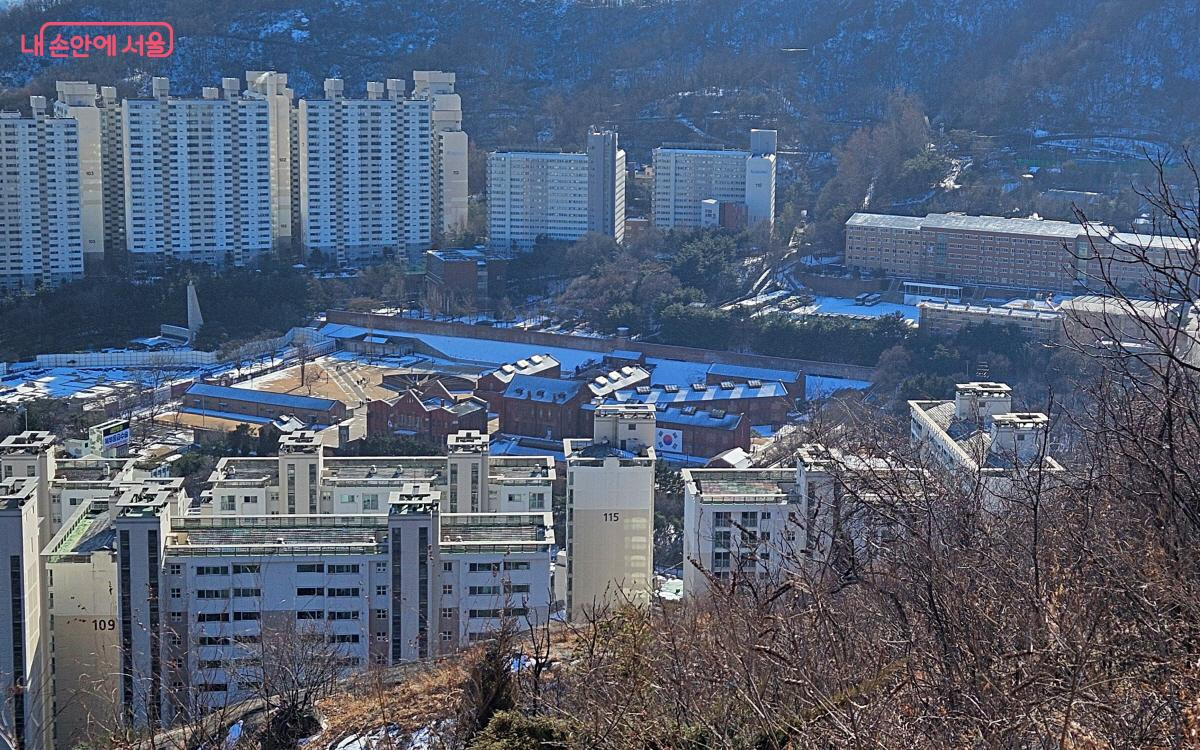 선바위 뒤로 올라가 내려다보는 서울. 선바위 뒷모습도 보인다.