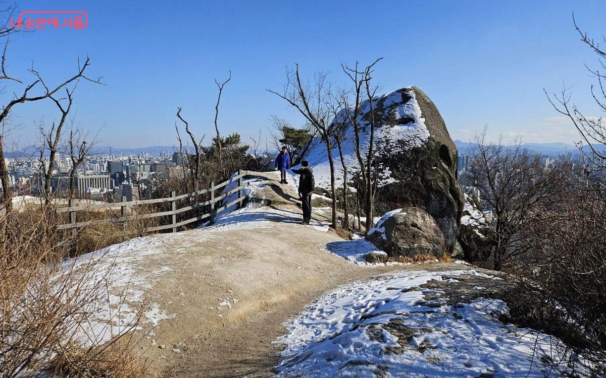 선바위를 뒤로 하고 다시 바위를 오르면 평평하게 넓은 바위가 평상처럼 펼쳐진다. 햇빛 좋은 날 말 그대로 ‘멍 때리고’ 쉬기 아주 좋은 명당이다. 다시 커다란 바위를 돌아 오르면 해골바위가 머리 위로 나타난다. 이 바위 위로 올라서면 서울이 한눈에 펼쳐진다. 서대문 방향으로 서대문형무소도 바로 내려다보인다. 해가 질 무렵 어느 날은 정말 멋진 일몰을 볼 수도 있는 곳이다.