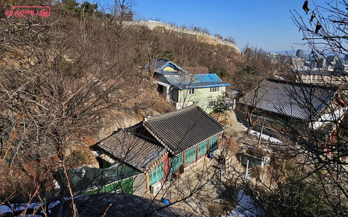 선바위로 올라가면서 내려다본 국사당. 그 위로 성곽이 이어져 있다.