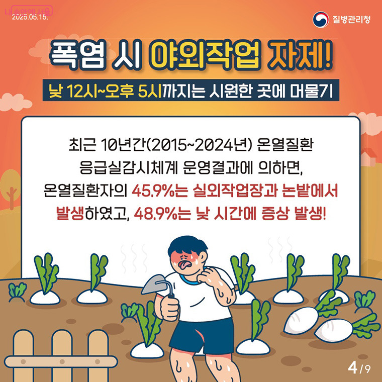 최근 10년간(2015~2024년) 온열질환 응급실감시체계 운영결과에 의하면, 온열질환자의 45.9%는 실외작업장과 논밭에서 발생하였고, 48.9%는 낮 시간에 증상 발생!