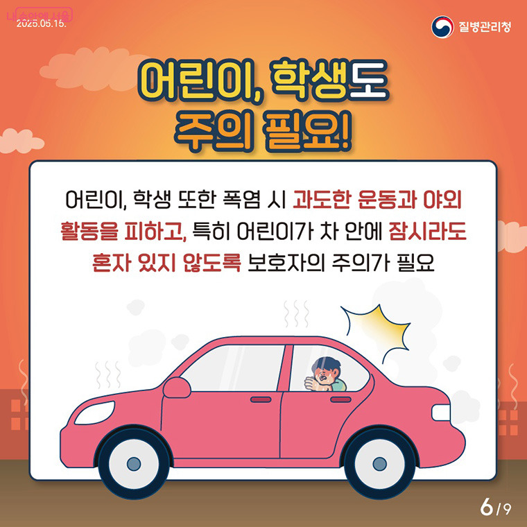 어린이, 학생 또한 폭염 시 과도한 운동과 야외활동을 피하고, 특히 어린이가 차 안에 잠시라도 혼자 있지 않도록 보호자의 주의가 필요