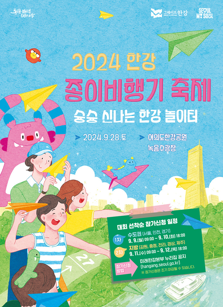 서울시는 9월 28일 ‘2024 한강 종이비행기 축제’를 열고, 종이비행기 대회 참가자를 9월 9일 오전 9시부터 12일 오후 6시까지 모집한다. 참가신청은 미래한강본부 누리집을 통해 선착순으로 진행한다.