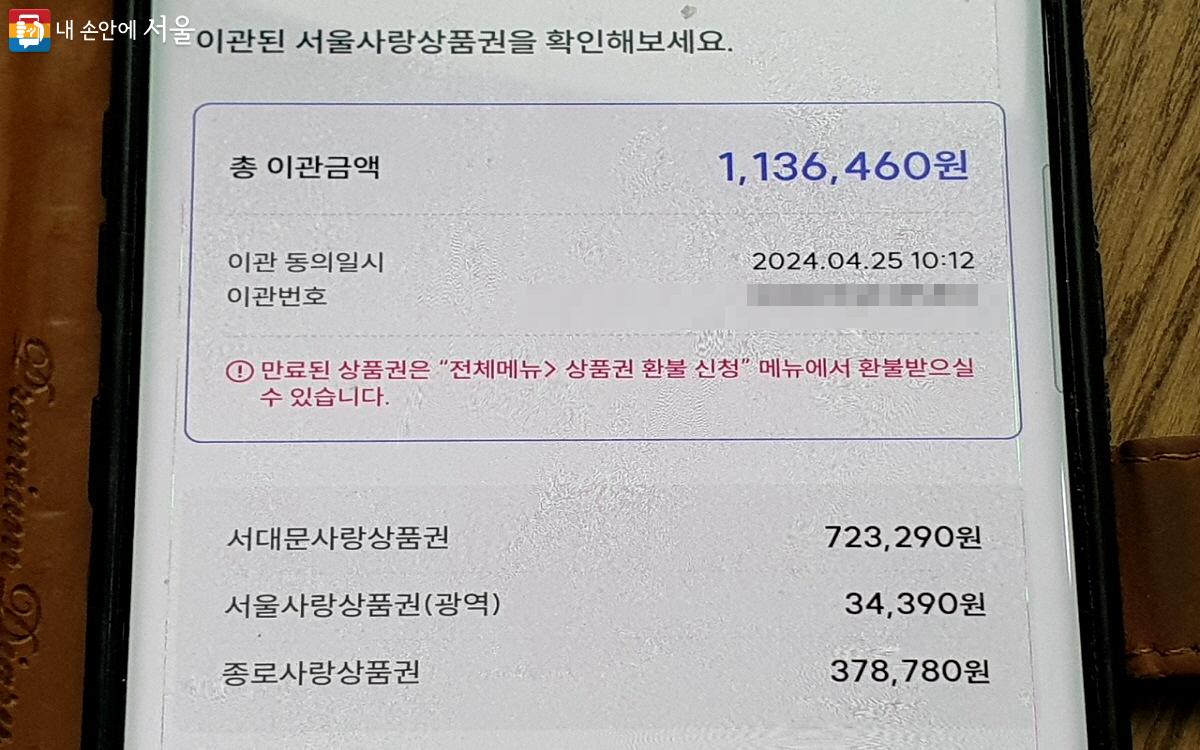 상품권 합산 결제가 된다는 점도 '밑줄 쫙'이다. 예를 들어 10만 원을 결제해야 하는데, 서울시 전역에서 모두 결제가 가능한 광역상품권이 2만 원 정도 남아 있고, 자치구 지역상품권이 8만 원 있다면, 기존에는 두 번 나눠서 결제해야 하는 번거로움이 있었다. 하지만 새 앱에서는 두 상품권을 합산해 한번에 결제할 수 있는 기능이 생겼다.