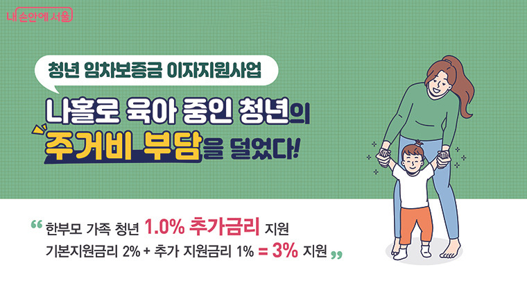 그 밖에도 시는 ‘청년 임차보증금 이자 지원’에 자녀를 양육하는 한부모 청년(만 19~39세 이하)의 주거비 부담을 덜어주기 위해 ‘한부모 가족 추가 금리’ 1% 지원 혜택도 신설했다. 2% 금리를 지원하는 ‘청년 임차보증금 이자 지원’에 이번 한부모 가족 추가 금리를 지원받으면, 자녀를 양육하는 한부모 청년은 최대 3%의 이자를 지원받을 수 있다.