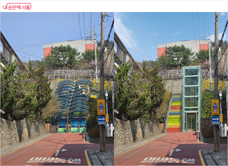 광진구 중곡4동 내 용곡초·중교의 통학로로 이용되고 있는 무지개계단은 등·하교 시 사용 인원이 몰리는 등 안전사고 위험이 있어 학부모들이 늘 노심초사했다. 이에 시는 기존 경사 37도의 가파른 계단을 대체할 수직 엘리베이터를 설치해 아이들이 안전하고 편리한 통학길로 조성한다.