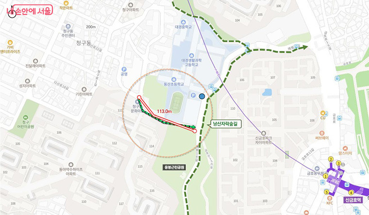 중구 신당동(남산 인근, 청구동 마을마당 앞) 계단은 길이가 113m로 길고 33도 이상의 급경사 계단으로 단절된 무장애 남산자락숲길을 연결해 주는 수직 및 경사형 엘리베이터를 설치해, 도심 주거지에서 15분 만에 도보로 숲에 갈 수 있는 ‘남산 숲세권’이 완성될 전망이다. 이를 통해 휠체어 장애인, 유아차 사용자 등 이동약자들도 편하게 남산을 즐기며 힐링할 수 있는 무장애길을 완성한다.