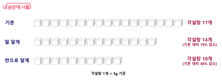 한 컵당 52.2g의 당 함량을 보인 기존 당도에 비해 ‘덜 달게’는 44.4g, ‘반으로 달게’는 31.9g으로 조사되었다. 당 함량을 1개 3g의 각설탕으로 환산하면 기존 당도의 스무디는 각설탕 약 17개에 해당하며, 이에 비해 ‘덜 달게’의 경우는 각설탕 약 3개, ‘반으로 달게’는 각설탕 약 7개가 줄어드는 셈이었다.