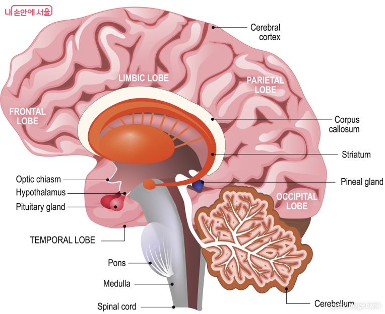 세 번째는 뇌간(Brainstem)이다. 소위 ‘숨골’이라고 들어봤을 텐데 호흡, 심장 박동, 체온 조절 같은 생명 유지에 필수적인 기능을 담당한다. 연수, 교뇌, 중뇌로 구성되어 있으며, 척수와 연결되면서 몸에서 뇌와 척수(말초) 신경을 연결해주는 다리 같은 역할을 한다.