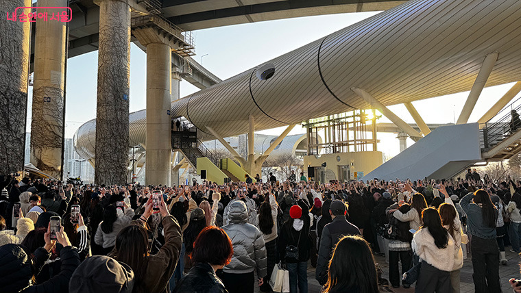 뚝섬한강공원의 자벌레 복합문화공간 모습. 외부에서 버스킹이 진행된다.