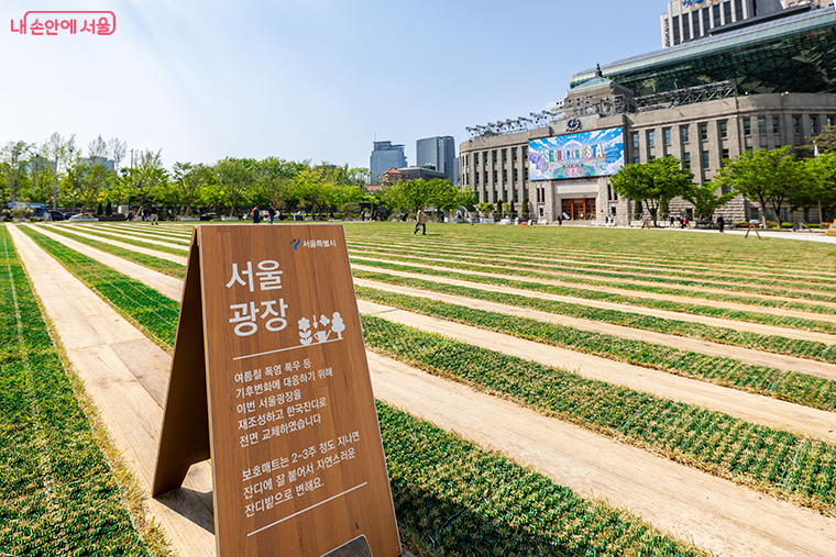 지난해 기준 서울의 여름 평균 기온은 25.6℃로 전년 대비 1.9℃ 상승했다. 이러한 기후변화에 대응하기 위해 기존 서울광장의 한지형 잔디를 난지형 잔디로 교체했다. 아울러 21년간 답압(밟아 눌러 토양이 침식되고 단단하게 눌린 현상) 등으로 불량했던 배수체계 등 시설도 정비해 잔디를 좀 더 효율적으로 관리한다.