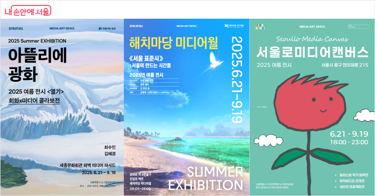 서울시는 6월 21일부터 9월 19일까지 매일 밤(18:00~23:00) 3곳(▴아뜰리에 광화 ▴해치마당 미디어월 ▴서울로미디어캔버스)의 ‘미디어아트 서울’을 통해 계절의 감성을 담은 특별한 문화 경험을 선사한다.