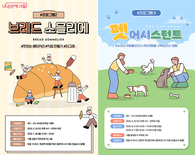 명지전문대학과의 협업을 통해 올해 신설된 ‘진로 잡(Job)아봐’는 진로 설계에 어려움을 겪는 서울런 중·고등학생 회원 60명을 대상으로 진행된다. 학생 선호조사를 거쳐 올해는 항공승무원과 스포츠지도사 프로그램이 운영된다. 교육은 8월 19일과 20일 이틀간 실시되며, 참가자 모집은 7월 초 공지된다.