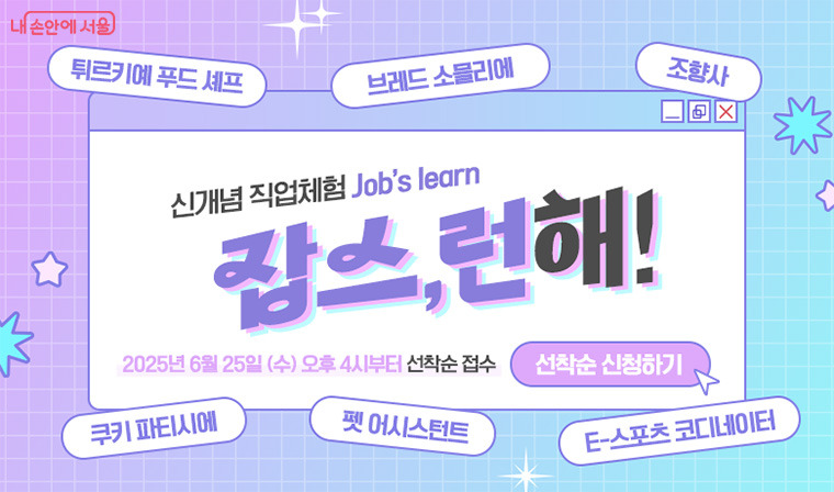 ‘잡스런(Job’s Learn)’은 다양한 직업 현장 체험 프로그램으로, 올해는 글로벌 푸드 쉐프, 브레드(빵) 소믈리에, 펫 어시스턴트(반려동물 관리사), 조향사, e-스포츠 코디네이터, 쿠키 파티시에 분야의 직업 체험이 진행된다.