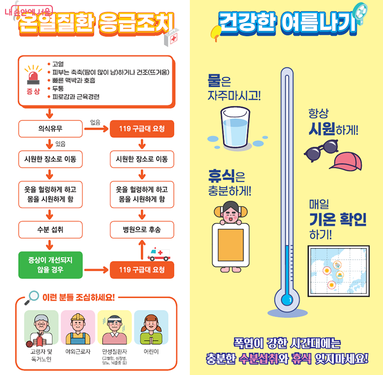 역대급 찜통더위에 외출하기 두려운 날들이 이어지고 있습니다. 서울시는 온열질환자 발생을 최소화하기 위해 폭염취약계층 보호를 강화하고 폭염저감시설을 확대하는 등 철저한 피해 대비에 나섰습니다. 안전하고 건강한 여름나기를 위해 폭염 대비 시민행동요령 및 무더위 쉼터 정보 등을 꼭 확인하세요!