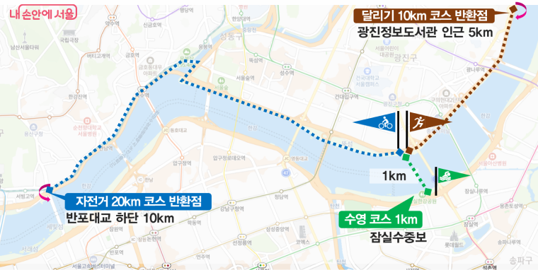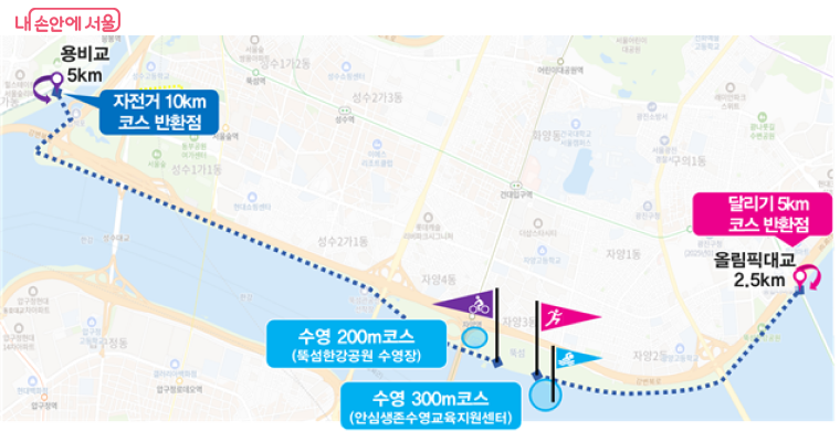 뚝섬한강공원에서 5월 30일부터 6월 1일까지 진행되는 이번 경기에는 총 3만 명이 참여할 예정으로, ▴초급자 코스(수영 300m, 자전거 10km, 달리기 5km)와 ▴상급자 코스(수영 1km, 자전거 20km, 달리기 10km)가 있어 운동에 자신이 없는 초심자도 부담 없이 신청할 수 있다.