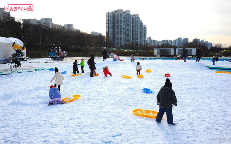 한강공원의 눈썰매장은 수영장의 휴장 기간을 활용, ‘눈썰매 슬로프’와 ‘눈놀이동산’이 조성되어 남녀노소 누구나 겨울철 신나는 야외 활동을 즐길 수 있는 도심 속 겨울 레저 공간이다.