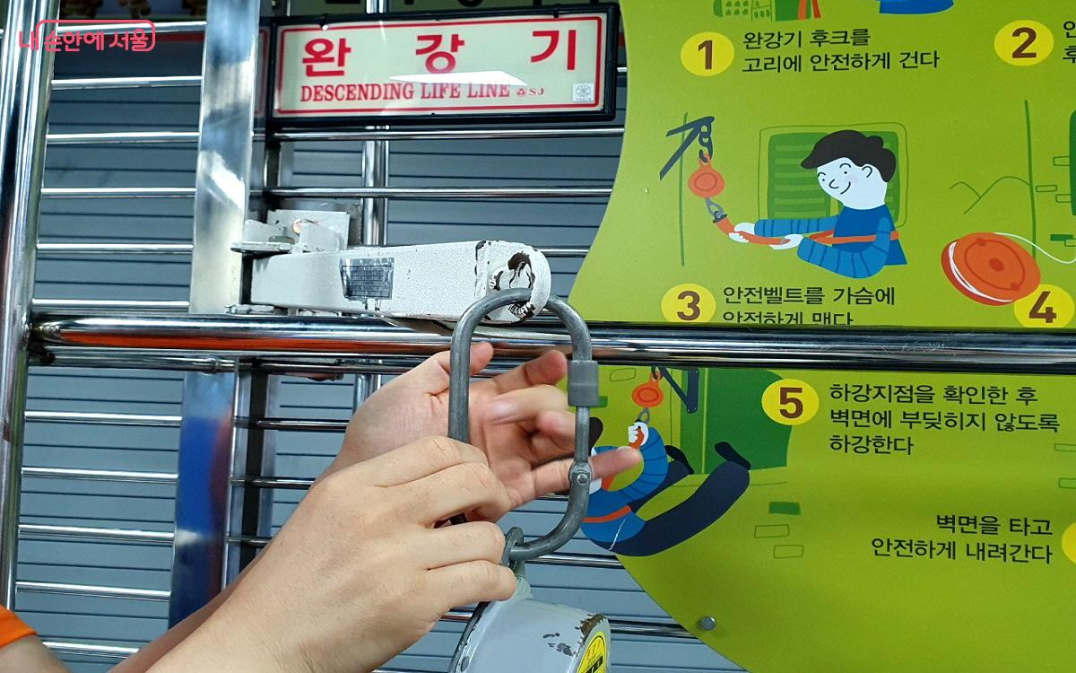 완강기 벨트를 가슴 높이까지 걸고 줄을 바짝 조인다. ©엄윤주