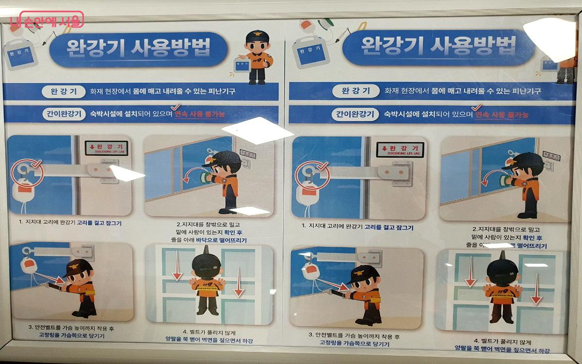그러나 얼마 전 부천 호텔 화재 때 완강기가 있었음에도 제대로 쓰이지 못한 점이 지적되면서 사용법에 대한 관심이 높아졌다. 이번 사건을 계기로 완강기는 사용법을 알아야만 사용할 수 있다는 점이 부각되기도 했다. 고층건물이 많아진 요즘, 소화기 사용법만큼 중요해진 완강기 사용법! 광나루 안전체험관을 찾아가 완강기 사용법과 주의사항 등을 자세히 알아봤다.