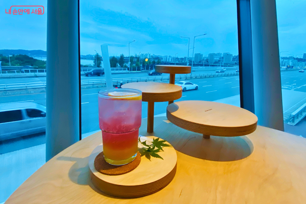 카페 공간은 건물의 2층과 3층에 복층 구조로 구성되어 있으며, 각 층마다 서로 다른 매력을 선사한다. 2층은 한남대교를 가로지르는 차량의 움직임과 저 멀리 우뚝 솟은 남산서울타워를 정면으로 바라볼 수 있는 역동적인 뷰가 일품이다. 반면 3층은 전면 유리창을 통해 탁 트인 한강의 전경을 한눈에 담을 수 있어 한층 더 개방감을 느낄 수 있다. 창가 좌석에 앉아 있으면 마치 강물 위에 떠 있는 듯한 착각을 불러일으킬 정도로 몰입감이 뛰어나다.
