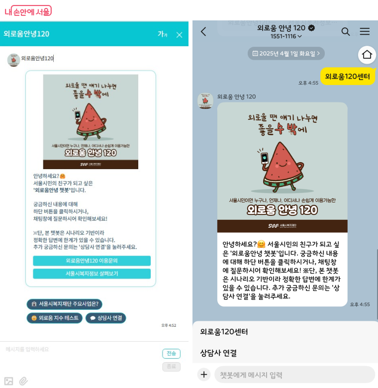 시는 전화 통화가 어렵거나 전화를 선호하지 않는 시민을 위한 ‘외로움안녕 챗봇’도 별도 운영해 외로움‧고립‧은둔 지원사업을 안내하고, 전문 상담사 채팅 상담도 제공한다.