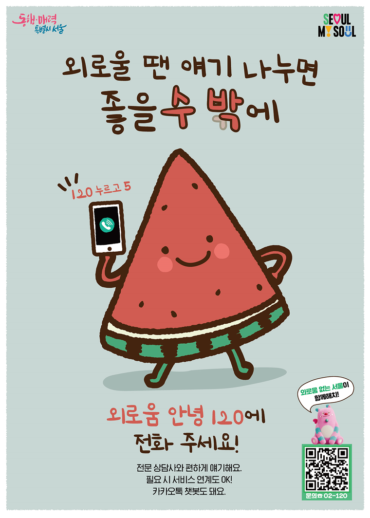 또 시는 보다 많은 시민들이 외로움안녕120을 인지할 수 있도록 1인가구가 자주 이용하는 편의점 ‘CU’, ‘GS25’와 배달앱 ‘배달의 민족’과 협력하여 홍보도 진행할 예정이다.