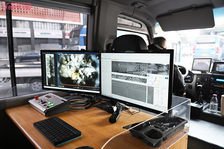 서울시 직원들이 땅꺼짐 탐사대 차량에 실린 장비를 점검하고 있다.