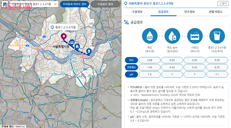 수질 정보는 서울시가 관리하는 취수장, 정수센터, 배수지, 수도꼭지에 설치된 527개소 수질자동측정기에서 실시간으로 측정해 공급경로와 경로별 수질 정보를 20분마다 제공한다.