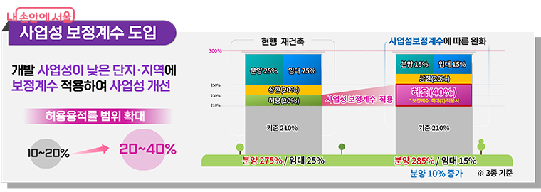 ‘사업성 보정계수’는 단지 또는 지역 간 사업성 편차를 줄이고 사업성을 높여주기 위해 지가뿐 아니라 단지 규모․세대밀도 등을 고려해 ‘허용용적률’에 보정계수를 최대 2.0까지 적용(재개발은 지가만 고려)해 주는 제도다. 시는 현재 20% 수준인 ‘허용용적률 인센티브 범위’를 최대 40%까지 늘려 사업성을 보전해 줄 계획이다.