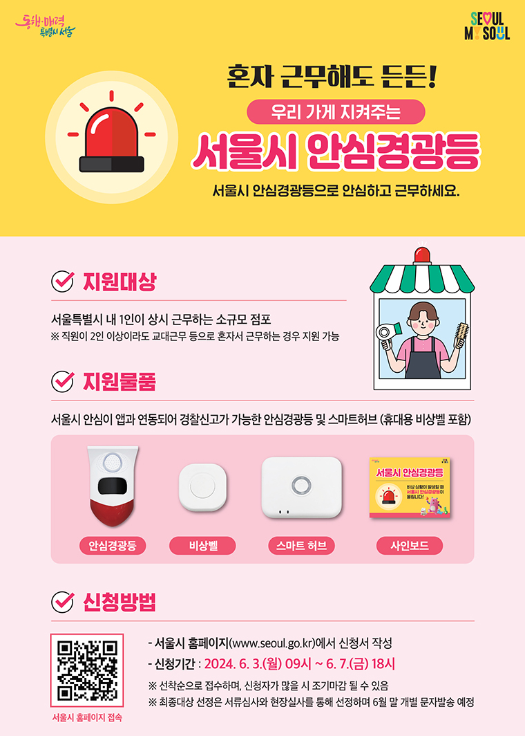 이번 안심경광등 지원대상은 총 5,000개 점포이며, 서울시 내 1인 가게 사업주라면 누구나 신청할 수 있다. 직원이 2명 이상이더라도 교대근무 등으로 장시간 1인이 근무하는 경우 신청이 가능하다.