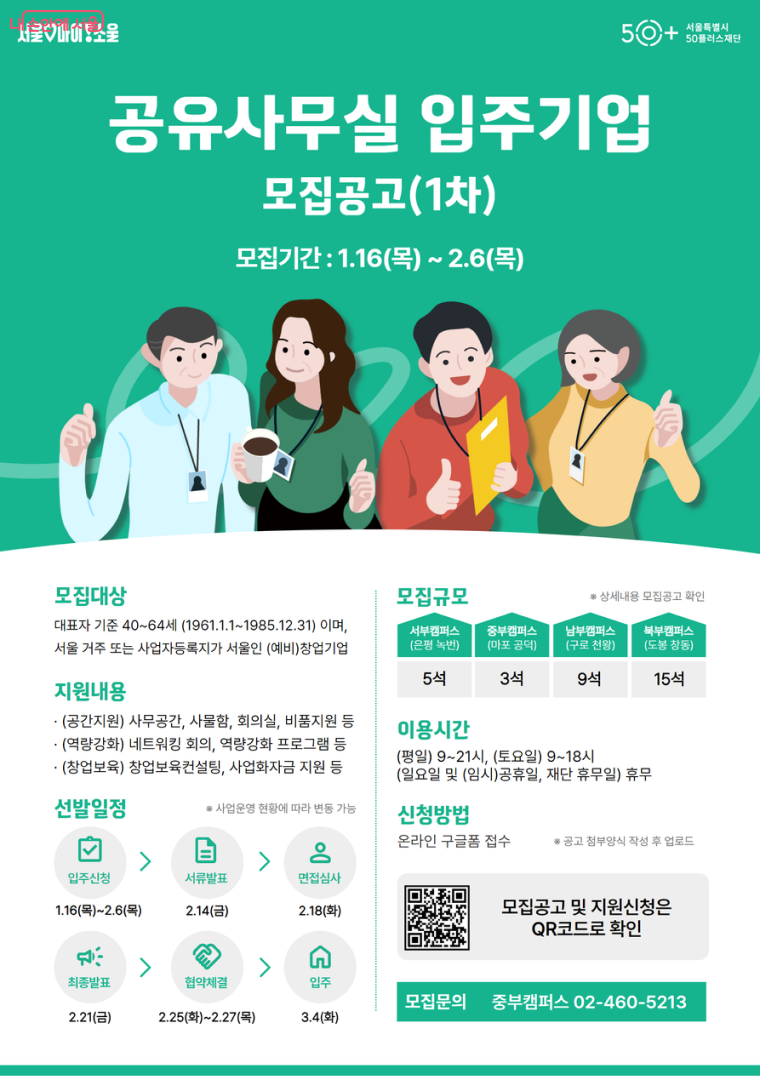 접수는 2월 6일 오후 5시까지 50+포털을 통해 진행되며, 세부적인 신청 자격과 제출 서류 등 자세한 정보도 해당 누리집에서 확인할 수 있다. ☞공유사무실 입주기업 모집 안내 페이지