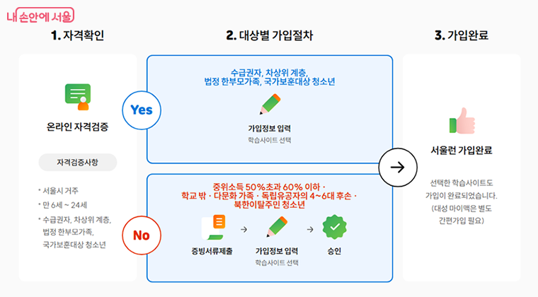 수급권자나 차상위계층 가구 및 국가보훈 대상자 청소년은 서울런 누리집에서 온라인 자격 검증을 통해 회원가입 후 바로 서비스 이용이 가능하다.