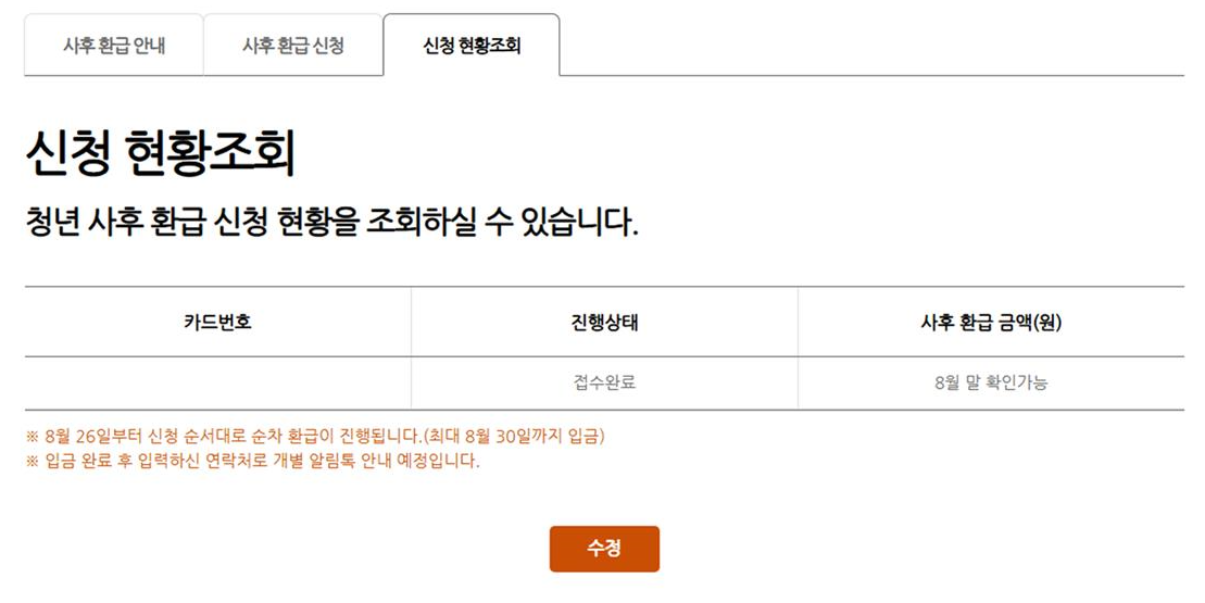 환급액은 앱이나 웹에 등록된 기후동행카드와 이용자의 연령 및 본인 여부 등 확인을 거쳐 11월 18일~11월 22일 중에 본인 명의 계좌로 순차적 입금되며, 입금 완료되면 신청자에게 개별적으로 알림톡이 발송될 예정이다.