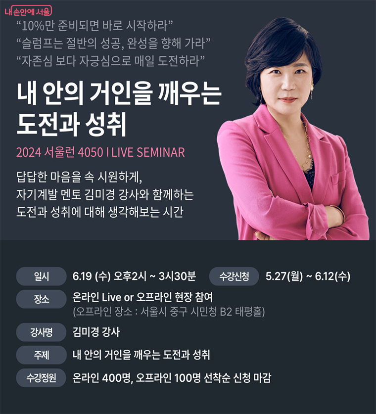 한편, 19일에는 온‧오프라인 명사 특강도 진행된다. 스타 강사 김미경이 ‘내 안의 거인을 깨우는 도전과 성취’를 주제로 중장년들에게 활력과 용기를 불어넣는 강의를 펼친다. 특강은 19일 오후 2시부터 서울시청 지하 1층 시민청 태평홀에서 진행되며 온라인 라이브도 진행된다.