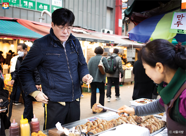 전통시장에서 사 먹는 길거리 음식으로는 역시 어묵꼬치가 으뜸이다. 특히 요즘처럼 혹한이 이어질 때는 뜨거운 국물을 곁들여 꼬치 한두 개로 속을 풀어본다. 이 시장은 빨간 어묵이 인기 있다. 떡볶이와 함께 색깔부터 매운 어묵으로 화끈하게 속을 데웠다.