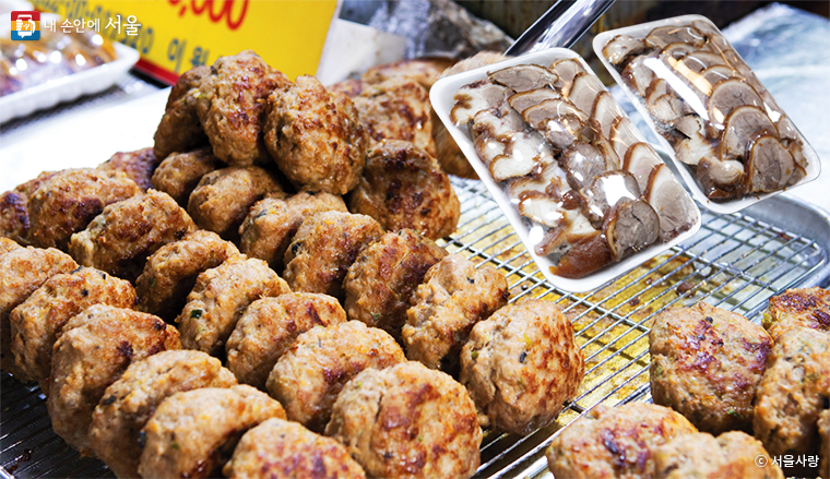 요즘 시장은 과거에 ‘앉아서 먹던’ 음식을 거리에서도 먹을 수 있도록 테이크아웃으로 개발하는 게 붐이다. 새로운 세대의 유행에 맞기도 하고 간편하면서 가게에 앉아 먹을 때 보다 판매량을 늘릴 수 있어서 전통시장 상인들의 아이디어가 속출한다. 식탁에 앉아서 먹는 걸로 알았던 떡갈비를 테이크아웃으로 먹을 수 있는 가게도 있다. 떡갈비는 육즙이 풍부하고 워낙 장사가 잘되어 회전율이 좋은지 겉이 촉촉하다. 한 개만 먹어도 배가 든든하다.