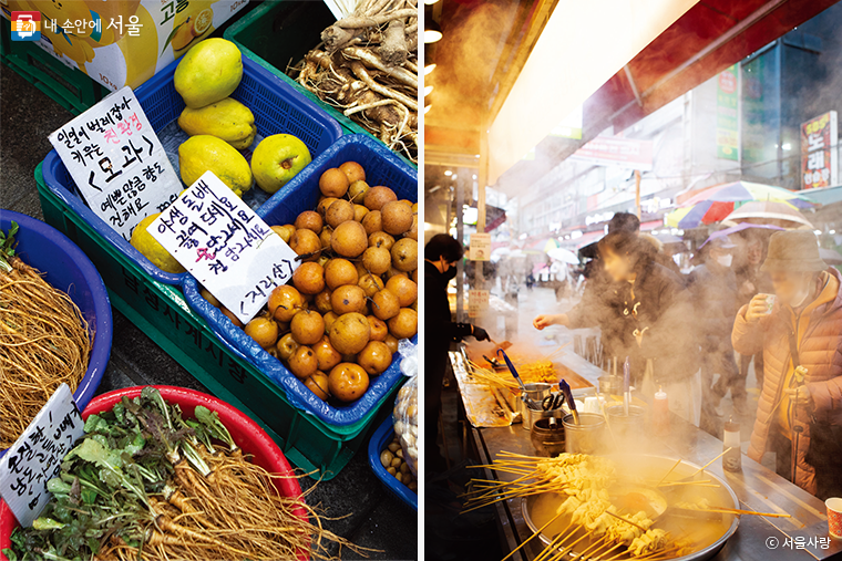 뭐니 뭐니 해도 시장에선 장보기와 함께 맛있는 음식을 먹는 것이 큰 즐거움이다. 소위 인스타그램 성지로 통하는 떡집에서는 앙버떡, 백설기, 사색 인절미를 팔고 있다. “보기 좋은 떡이 먹기도 좋다”는 우리말에 딱 들어맞는다. 막걸리 한잔과 함께 푸짐한 돼지 곱창을 즐길 수 있는 집도 있다. 매콤한 양념에 부드러운 곱창이 일품이다.