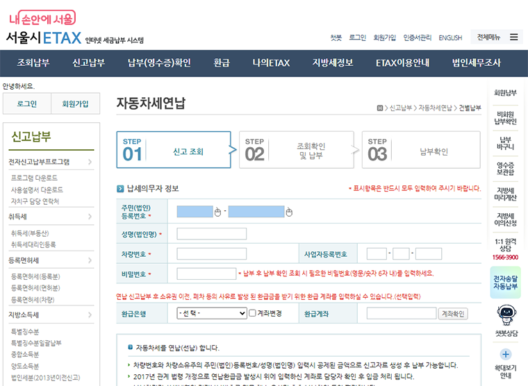서울시 ETAX 자동차세 연납 화면