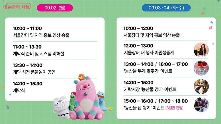 서울장터는 9월 2일부터 3일간 오전 10시~오후 7시시까지 운영되며, 판매 농수산물 외에도 행사 내용에 대한 자세한 정보는 서울장터 누리집을 통해 확인할 수 있다.