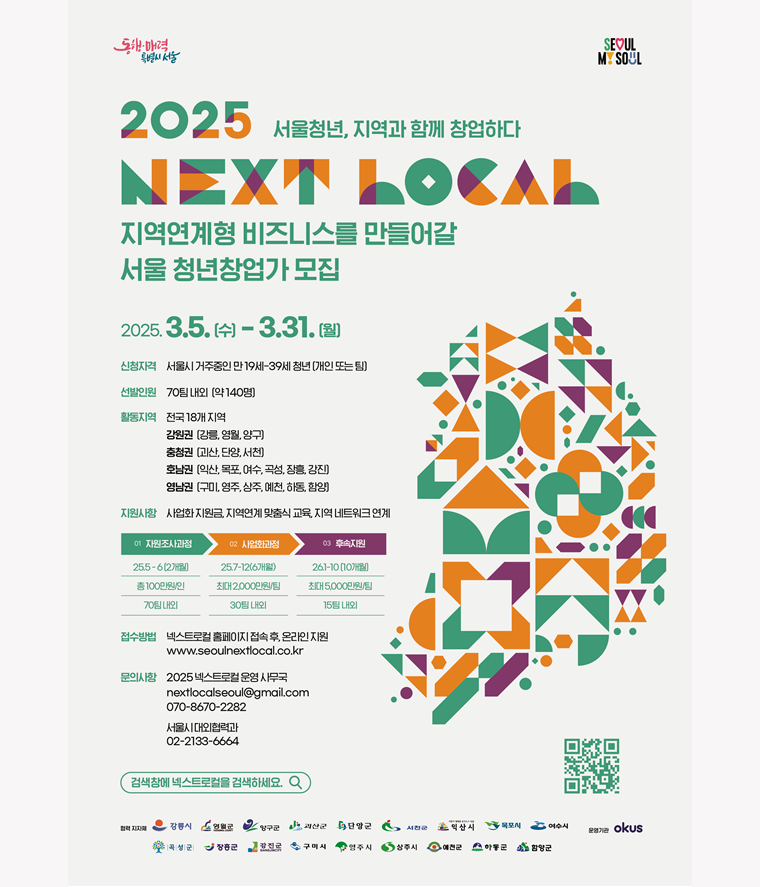 관련 문의는 운영사무국(070-8670-2282), 서울시 대외협력과(02-2133-6664) 또는 넥스트로컬 누리집을 통해 가능하다.