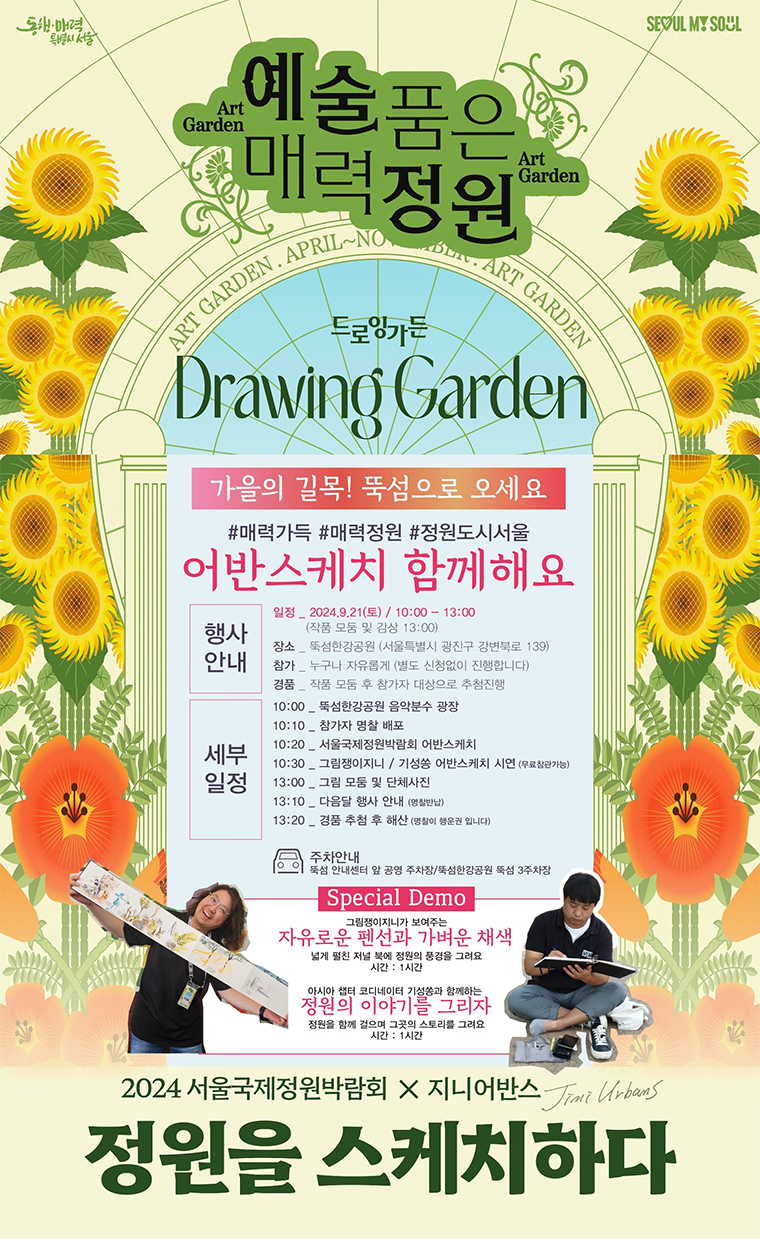 9월 21일 10시∼13시에는 서울국제정원박람회가 열리고 있는 뚝섬한강공원을 무대로 어반스케쳐스(Urban Sketchers)와 함께하는 ‘미술이 펼쳐지는 정원’이 진행된다. 사전신청 없이 누구나 자유롭게 참여할 수 있다.
