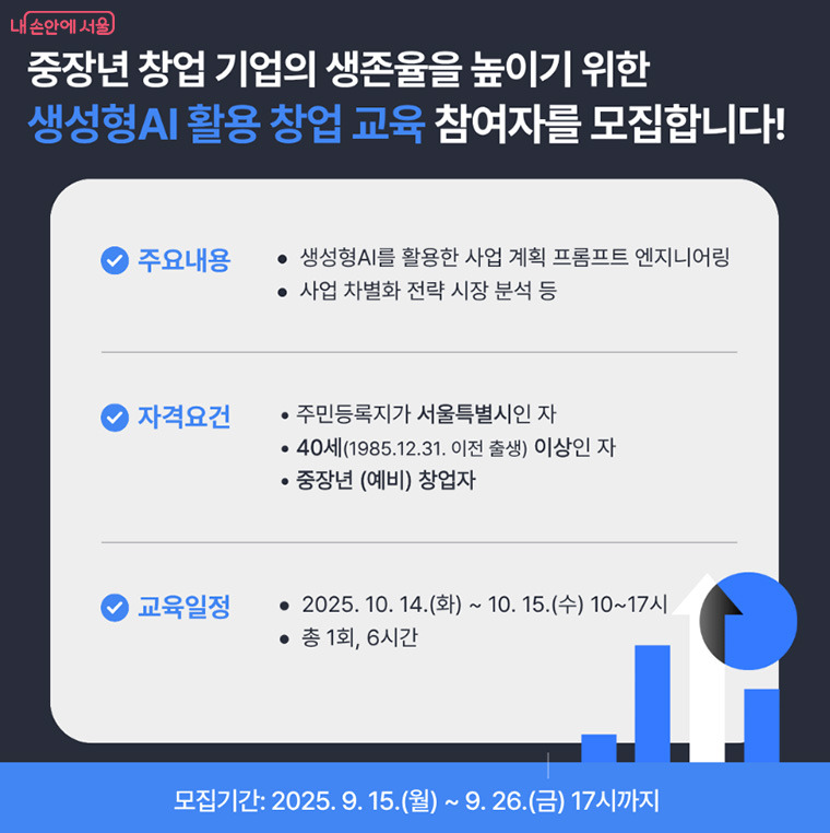 ‘생성형 AI 창업스쿨’은 서울 거주 40세 이상 중장년 (예비)창업가를 대상으로 생성형 AI를 활용한 사업계획 프롬프트 작성부터 시장분석, 차별화 전략 수립까지 실습 중심으로 교육을 진행한다. 중장년 창업가가 창업 효율성과 경쟁력을 높이고, 지속 가능한 창업 활동을 이어갈 수 있도록 지원한다.
