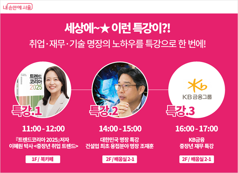 명사특강에서는 ‘트렌드코리아 2025’의 저자 이해원 박사가 중장년 취업 트렌드를 주제로 인사이트를 전할 예정이다. 이 외에도 조재홍 대한민국 용접 명장의 실전 취업 특강, KB금융의 재무 특강 등 실용적인 프로그램으로 구성해 참가자들의 취업 준비에 실질적인 도움을 줄 계획이다.