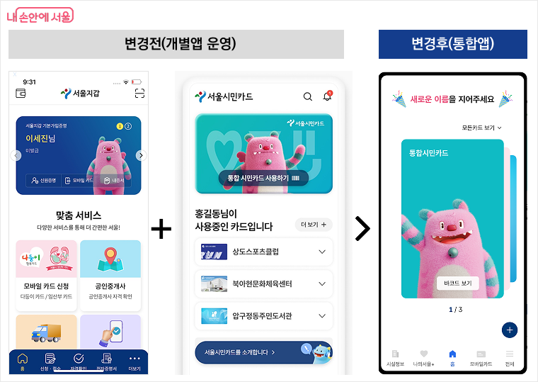 ‘서울지갑’ 사용자는 간편번호 재설정만으로 통합앱을 사용할 수 있고, ‘서울시민카드’ 이용자는 올해 말까지 정보 이관에 동의하면 기존 혜택을 유지할 수 있다. 시는 서울시민카드가 12월 말 폐기 예정인 만큼 올해 안에 동의절차를 이행해 줄 것을 시민들에게 당부했다.